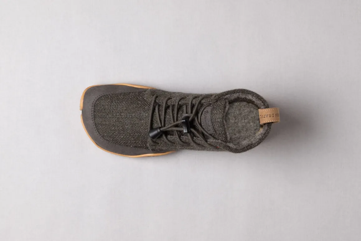 Das Obermaterial mit feinem Fischgratmuster besteht aus zwei Wollsorten: ungefärbte Wolle vom deutschen Landschafmix in naturmeliertem Braun in Kombination mit heller Wolle, die mit Färbepflanzen natürlich grün gefärbt wurde.