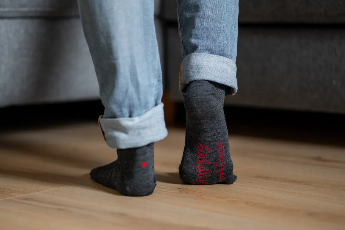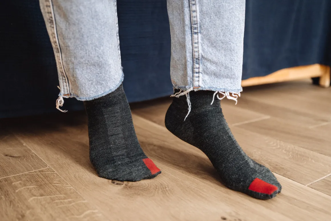 Der rote Punkt sitzt an der Ferse und hilft dir dabei, zu erkennen, wann die Socke zu klein geworden ist. Sobald er nicht mehr am richtigen Platz ist, wird es Zeit für die nächste Größe.